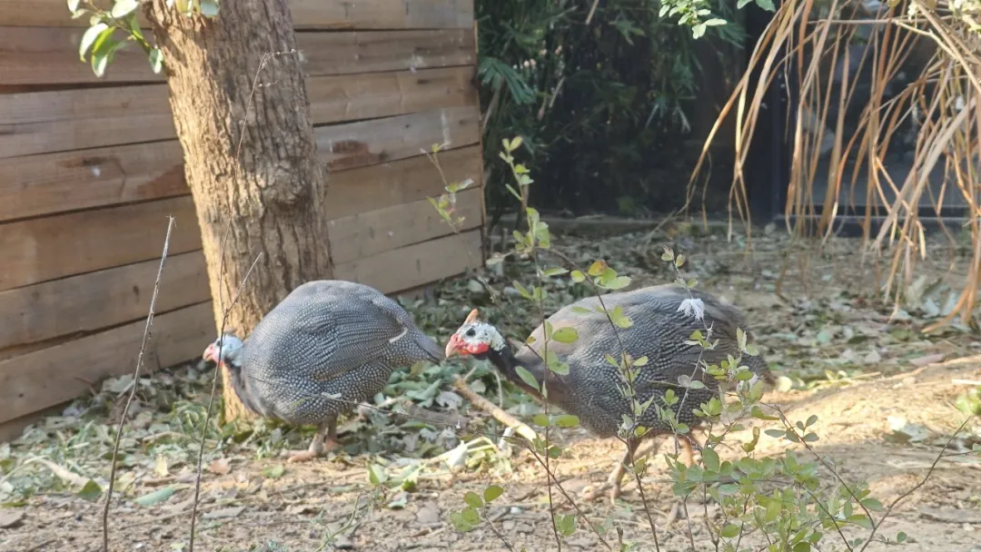 如果你低头看看脚下,会发现这里还有“地面漫步者”——两只珍珠鸡。它们偏爱在地面踱步、啄食,与空中翱翔的灰鹦鹉恰好形成默契的分层。它们的加入,不仅丰富了展区的生态图景,也在这里成为了灰鹦鹉的“好邻居”。一方天地,各有自在,正是我们想呈现的共生哲学。