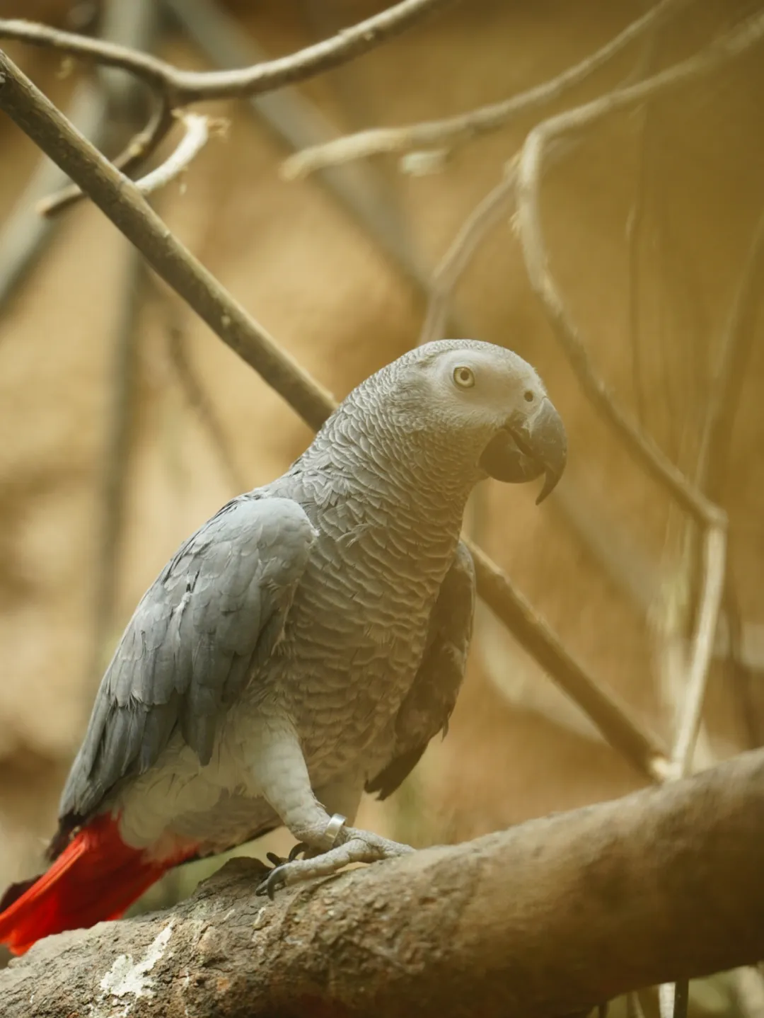 灰鹦鹉全身以深浅不一的灰色为主调,从深炭灰的背部过渡到胸前柔和的银灰。这种看似单调的色彩,在光线下却呈现出丝绸般的光泽。